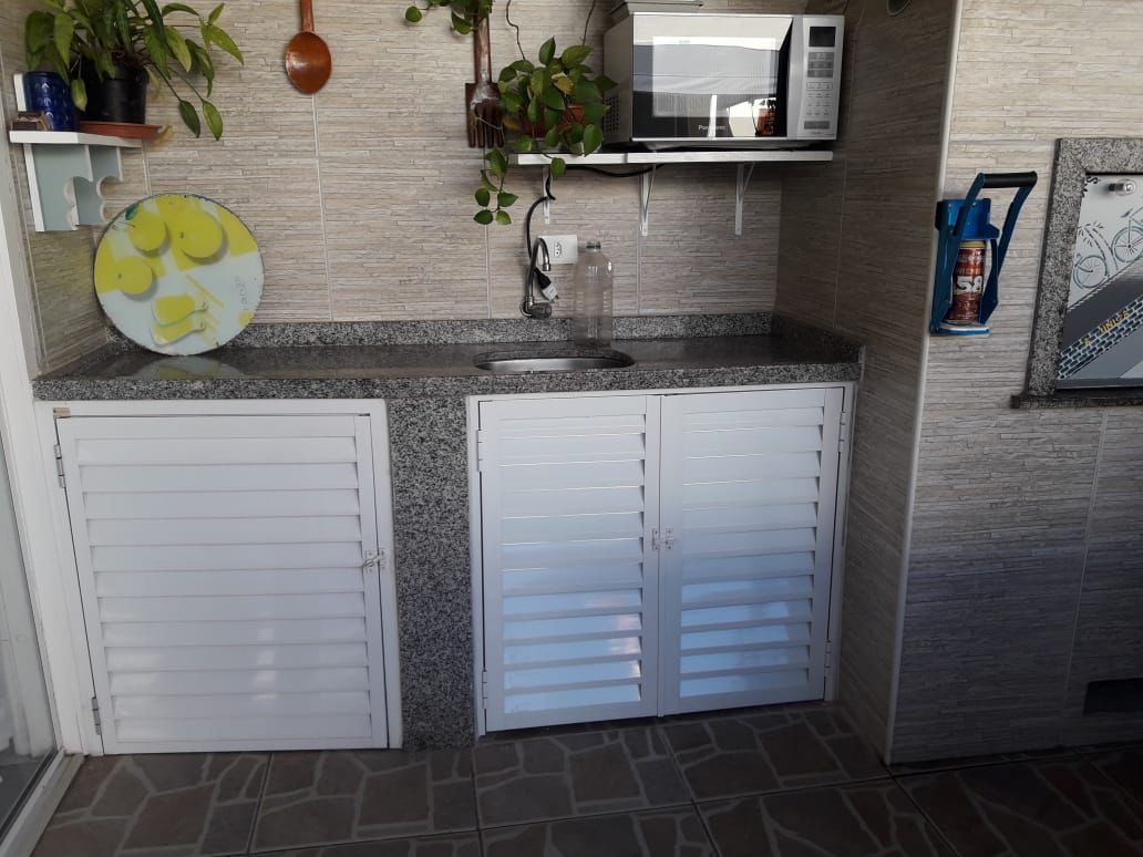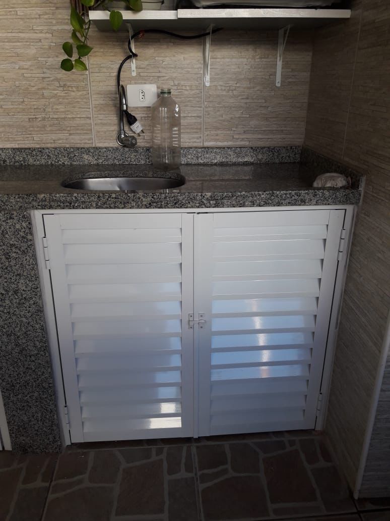 • Organização da área: a portinhola tampa espaços de armazenamento de ferramentas, utensílios, produtos de limpeza e mantimentos, deixando a área mais organizada e visualmente agradável.